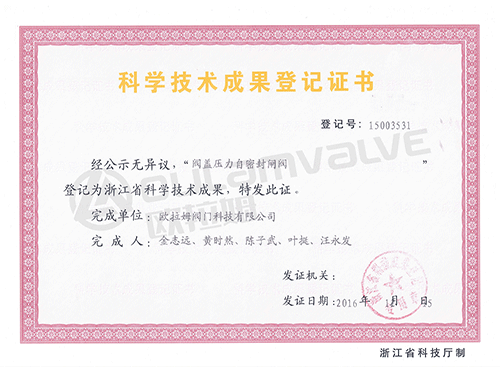 浙江省科学技术成果科学技术成果:阀盖压力自密封闸阀