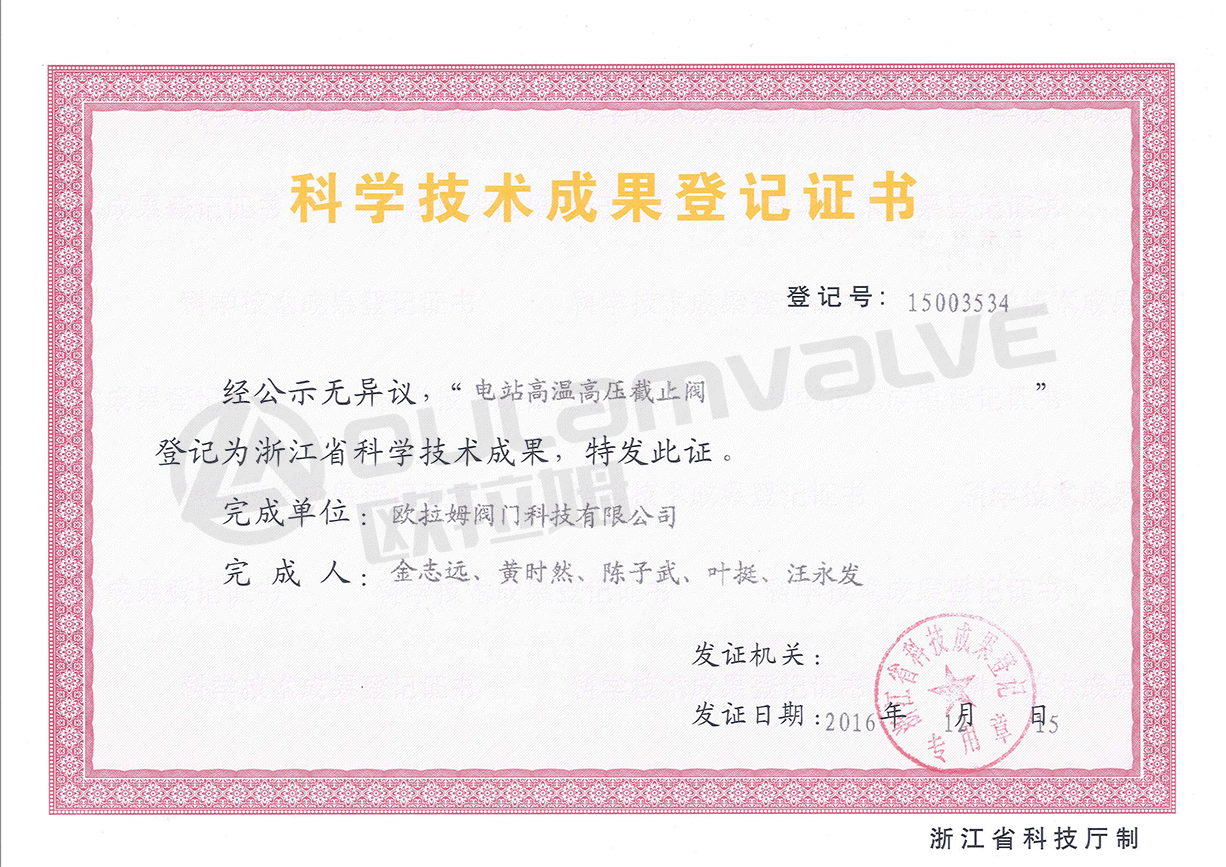 浙江省科学技术成果:电站高温高压截止阀