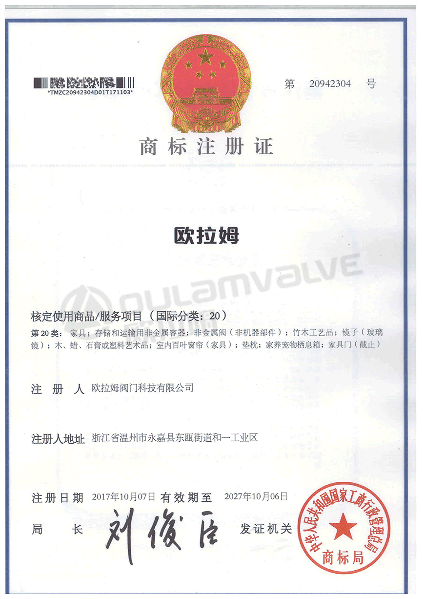 “圆形欧拉姆标志英文OULAM”商标注册证